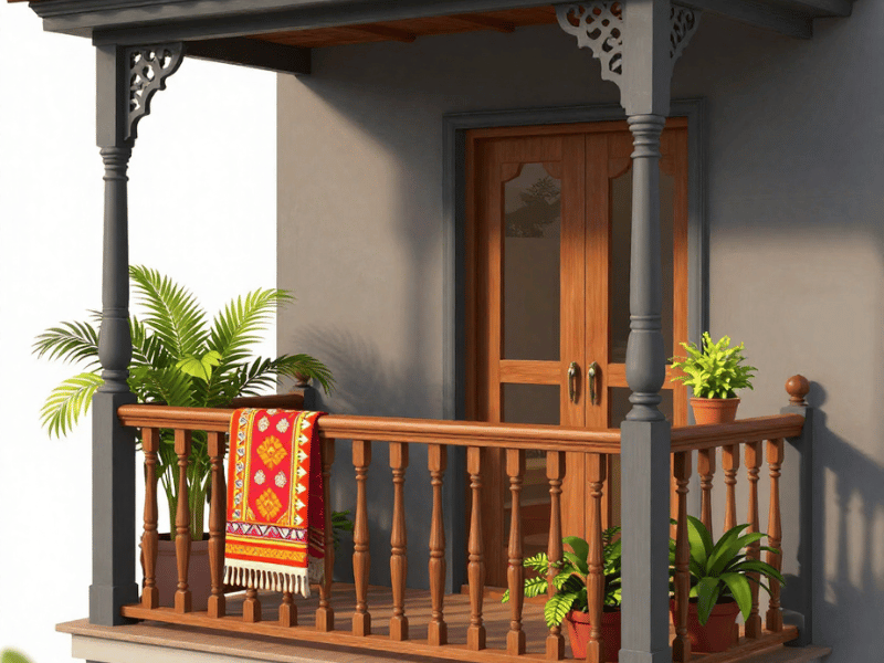 Beige and brown work well for homes that already use warm stone, wood, or traditional tiles. If you are sorting through balcony paint colours for a softer, welcoming feel, this combination gives you warmth without making the area look dark. Cane or wooden seating fits naturally here, and warm lighting improves the evening appearance without needing additional decor.