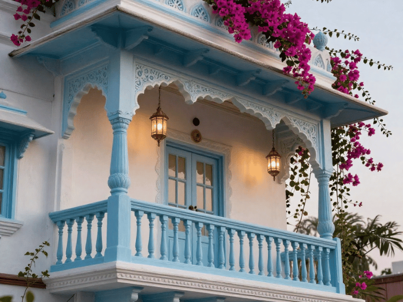 Pastel blue with white is a practical choice for compact balconies because it can feel open and tidy. Many homeowners shortlist it as the best colour for balcony walls when they want a light look that still has personality. Use white on trims, railings, or the ceiling for continuity, and keep fabrics light so the overall finish remains consistent.