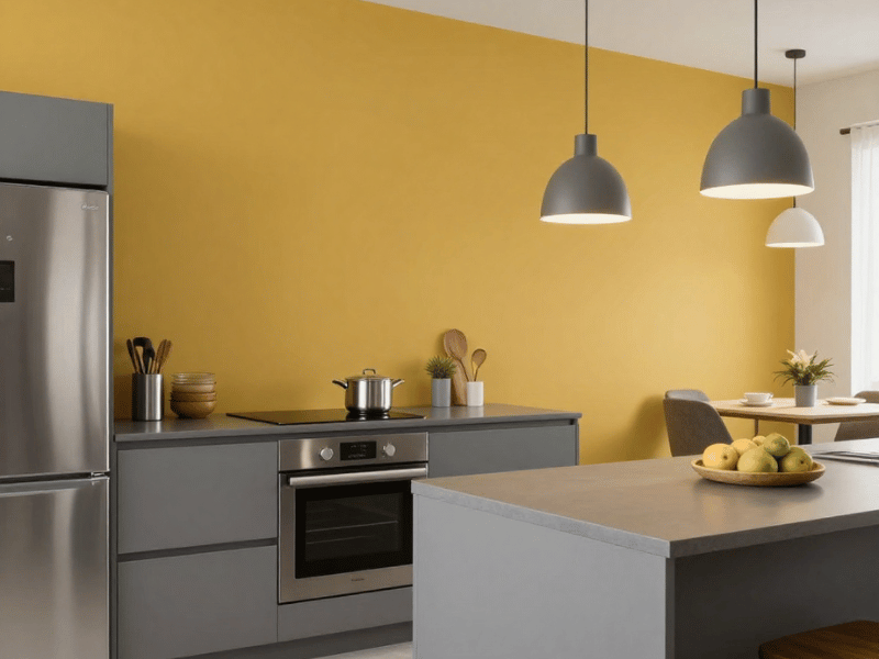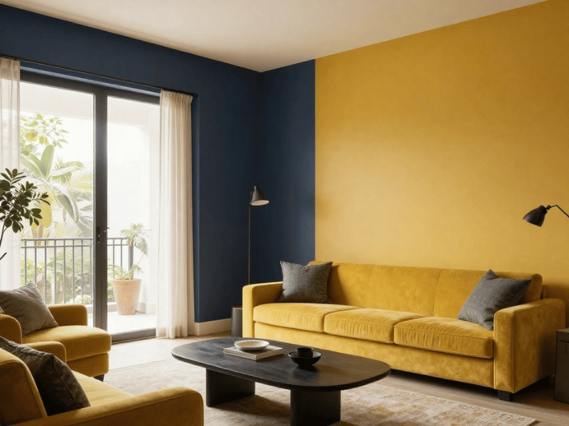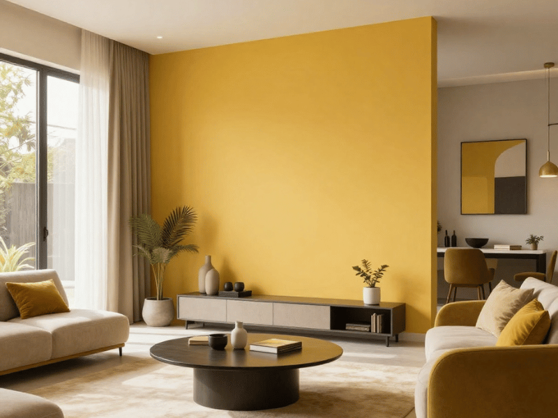 In modern homes, mustard yellow is often used as an accent colour rather than covering every wall. People usually pair it with shades like grey, black, or navy to create a clean and stylish contrast.