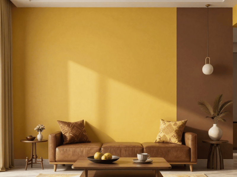 Brown and mustard yellow look warm and grounded. The earthy colours go well with wooden furniture and make a room feel inviting. This is one of the best mustard yellow wall colour combination ideas for homes with traditional or natural décor styles.