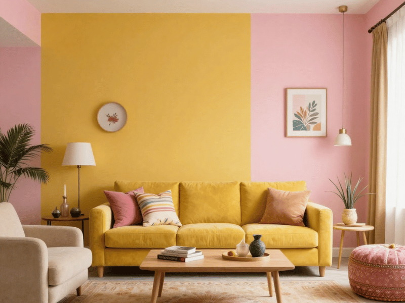 Mustard yellow and blush pink create a stylish and cheerful combination. The softness of blush pink balances mustard’s richness, resulting in a playful yet elegant look. Blush pink is the best colour to pair with mustard yellow in bedrooms, reading corners, or creative spaces.